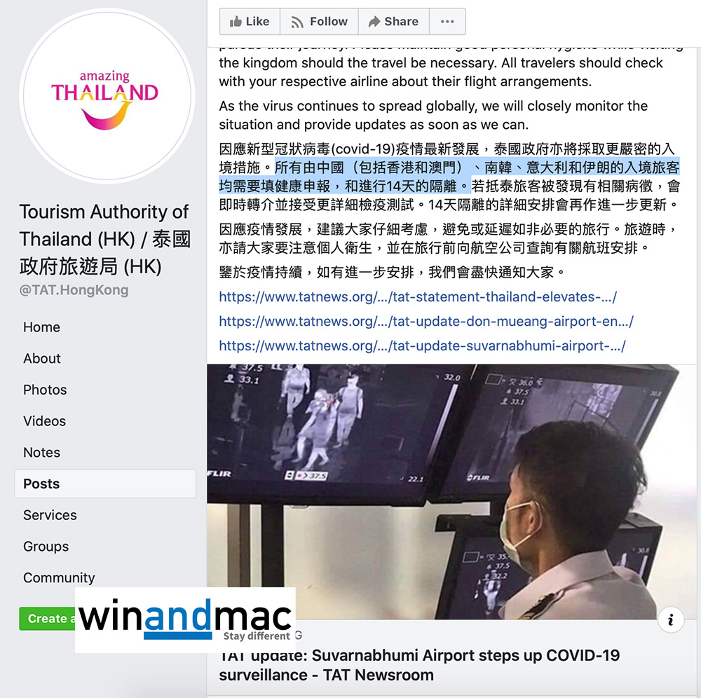 泰國曾於上星期刊憲,把中國等列為危險疫區,引發有國家不滿,泰國當時稱不會對這些地區的旅客實施強制隔離。可惜的是,今天泰國政府旅遊局宣佈,所有由中國(當中包括香港和澳門)、南韓、意大利和伊朗的入境旅客均需要填健康申報,此外亦要進行14天的隔離。各大香港旅行社開始取消有關旅行團。