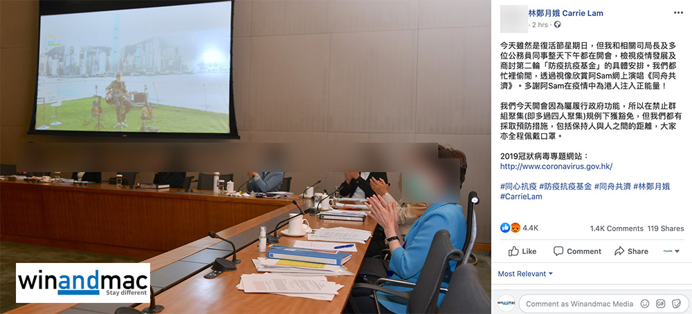 林鄭月娥在今天下午出文章,稱大家可以留在家中抗疫,因為可以睇許冠傑的網上演唱會。雖然主辦單位聲稱沒有與政府有任何預先溝通,但林鄭決定再添食,於晚上再發表相關文章。當中可以看到她與一班司長與公務員,一齊在大螢幕睇許冠傑演唱會。
