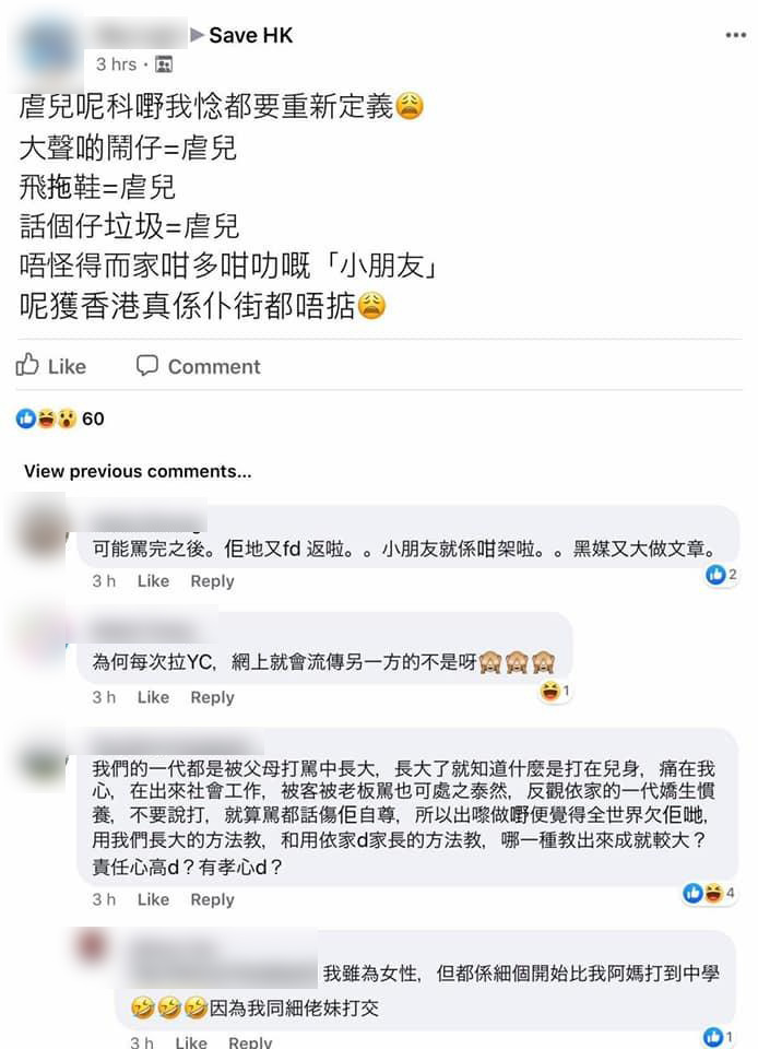 從網上截圖可以看到,有人一開始質疑虐兒的定義是否太廣,因為大聲鬧仔、飛拖鞋、話個仔垃圾都係虐兒,並引申到這樣的定義令香港而家有咁多咁叻嘅「小朋友」,似乎想暗示因為虐兒定義太廣,令香港有他們口中的暴徒。有人在留言狂罵傳媒報道是「大造文章」,又指他們那一代都是被父母打罵中長大,反而現在一代則嬌生慣養,有關留言一出有不少人和應。
