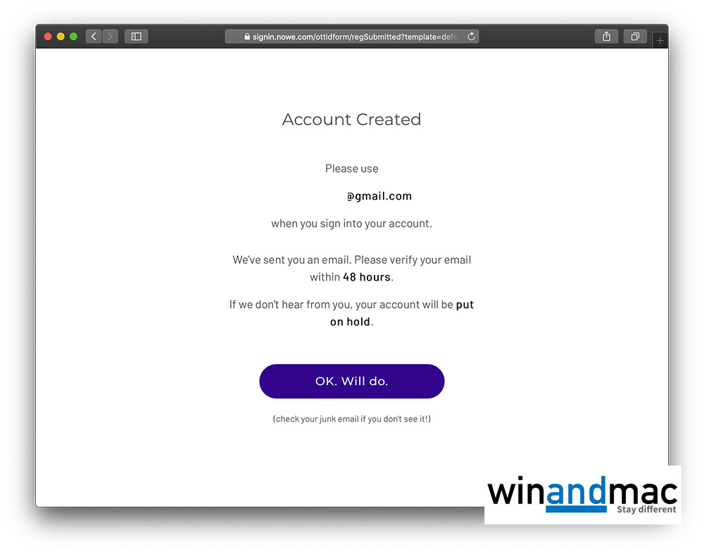 2. 按指示填好後,就會出現此畫面。我們測試時沒有收到電郵,或許是因為現在太多人登記,但沒有關係,大家仍然可以繼續去收睇。按一下畫面上的紫色按鈕繼續。