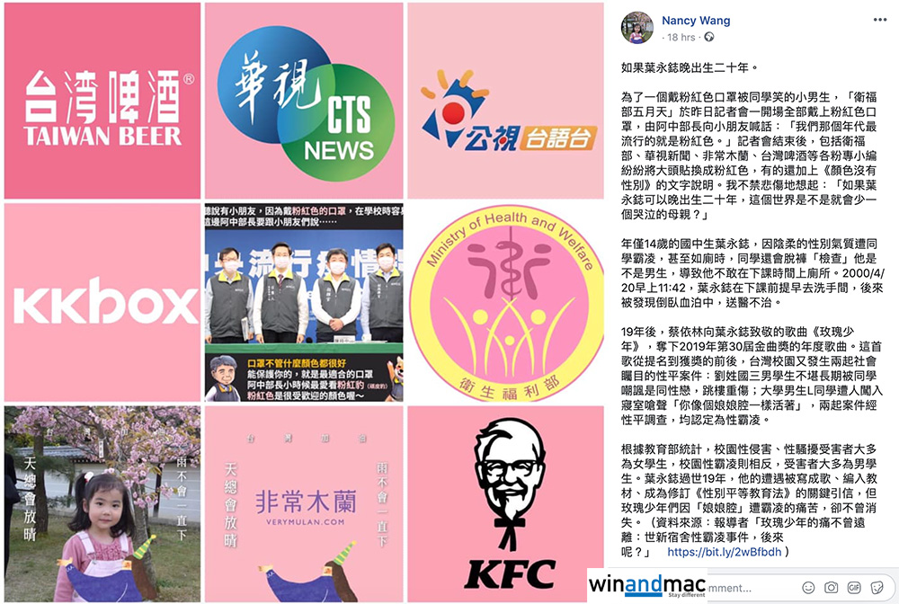 台灣在性別平權等工作都做得很好,致力做到男女平等。除了阿中部長外,很多台灣的品牌都立即支持。大家可以看到這一兩天包括台灣公視新聞、KKBOX、華視等logo,都加入粉紅色,一起化解大眾對粉紅色口罩的性別刻板印象。