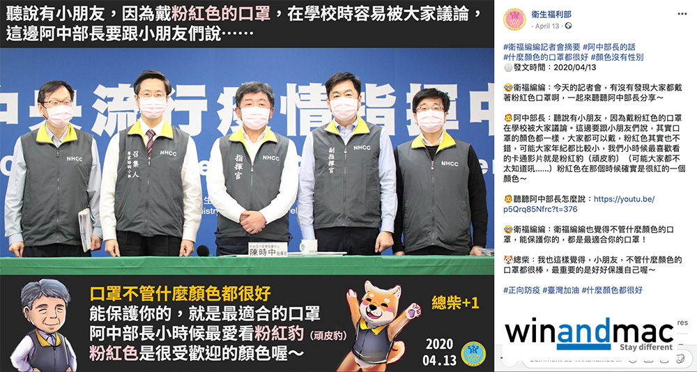 最近台灣有傳有位小朋友,因為本身是男生,怕戴粉絲色的口罩被人笑,所以不想戴著回學校。中央流行疫情指揮中心指揮官陳時中(台灣稱他是阿中部長)與其團隊,於4月13日出席記者會時,全部戴著粉紅色口罩。他們提到口罩顏色都一樣,大家都可以戴。他們更寫道「粉紅色其實也不錯,可能大家年紀都比較小,我們小時候最喜歡看的卡通影片就是粉紅豹,粉紅色在那個時候確實是很紅的一個顏色。」,大力支持顏色沒有性別。