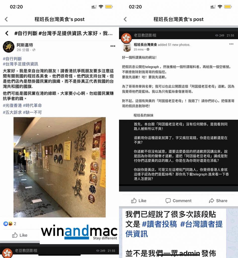 因為店內有國民黨的旗幟,被網民公開指責,稱程班長可能是國民黨在香港的線眼,令程班長相當激氣。程班長後來強調沒有掛過國民黨旗,他妹妹和他自己昨天寫道自己和家人是228事件的受害者。程班長曾要求有關社交網絡把假訊息刪除,但有相關的Telegram頻道竟然掉轉頭要求程班長道歉,事件發酵多天,仍然有人追擊程班長不夠黃,令程班長仍然相當氣憤。