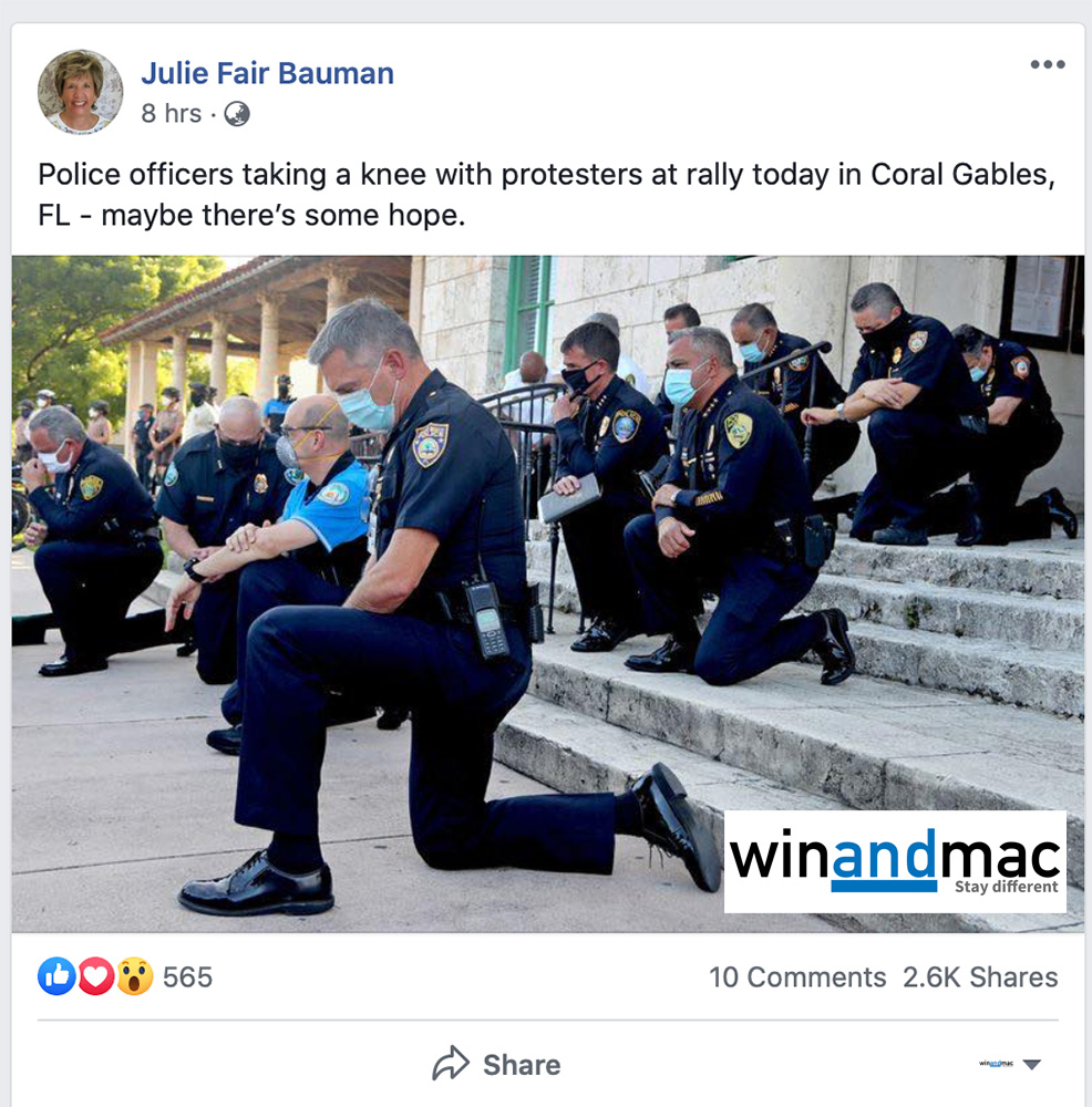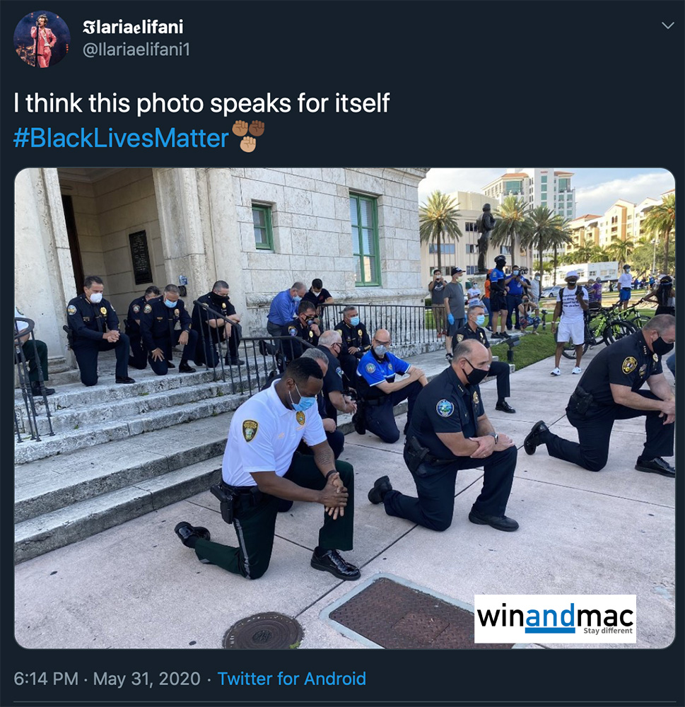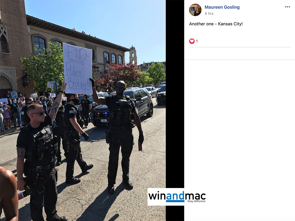 不過,這班藍絲和小紛紅沒有看到的是,CNN等傳媒於今天的新聞直播中,就有提到警隊希望藉此事重組改革。另外,就算是警察或執法者本身,不少都加入示威者互撐。網上有不少美國人分享相片,當中可以看到美國多個城市的警察都與示威者一起單膝跪下悼念死者(take a knee),甚至乎有警察拿起停止警暴的標語。另外,不得不提的是,CNN記者早前採訪有關示威時被捕,但其後州長立即道歉,並指不會再阻止記者採訪。