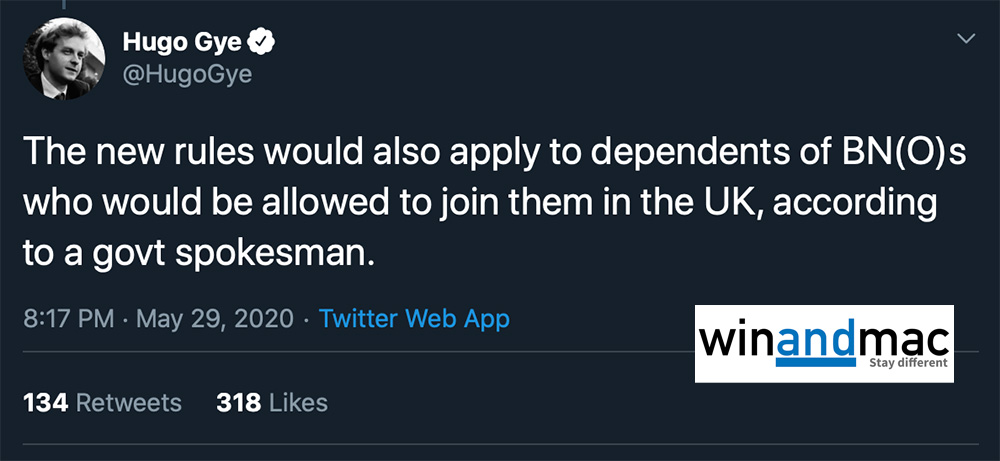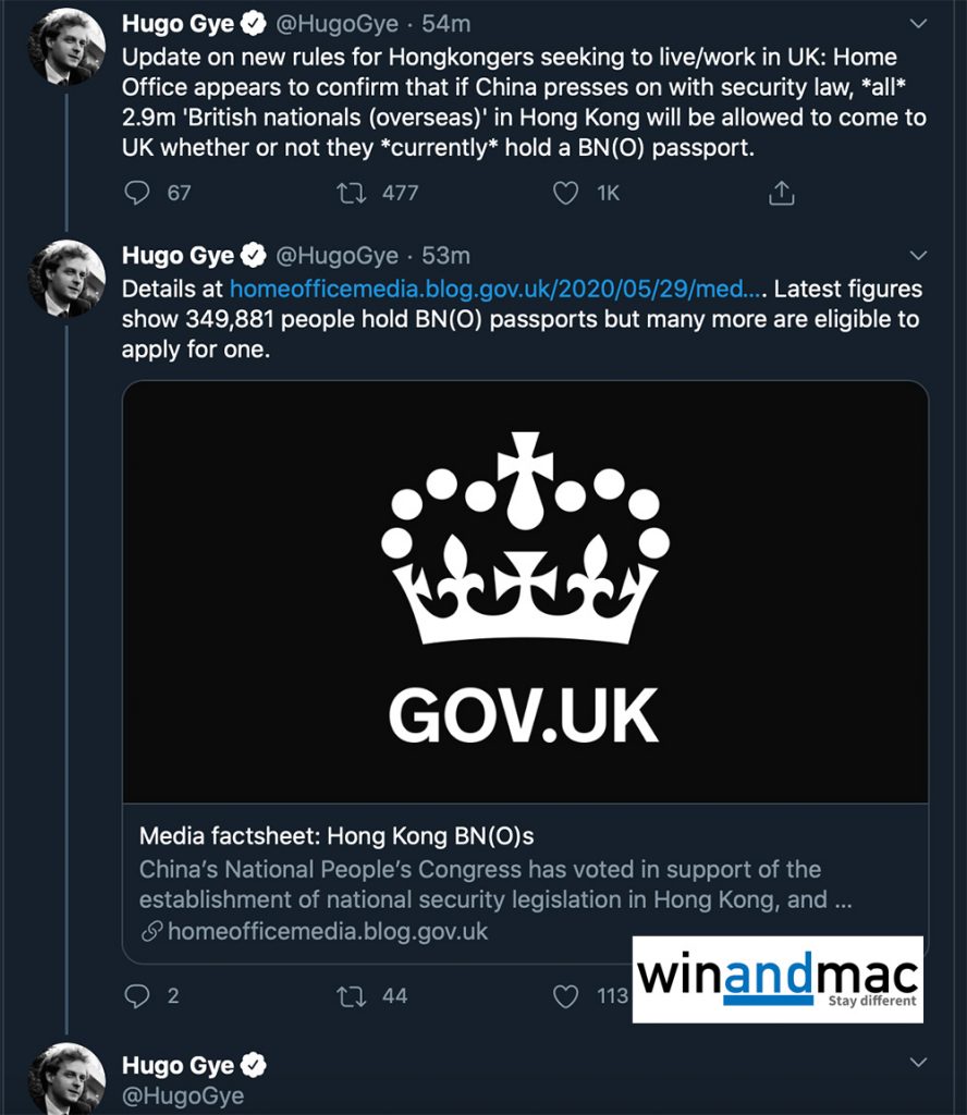當中內容與數小時提到相似,英國政府明白有歷史責任,若中國政府不聽勸告在港正式實行國安法,將會讓香港BNO持有人更大的簽證權限,不單可由原本留6個月增加至12個月,而且更可工作和讀書。當地英國i newspaper記者Hugo Gye提到,英國政府發言人表示,BNO相關親人應該都會照顧,可以跟隨去英國留12個月。