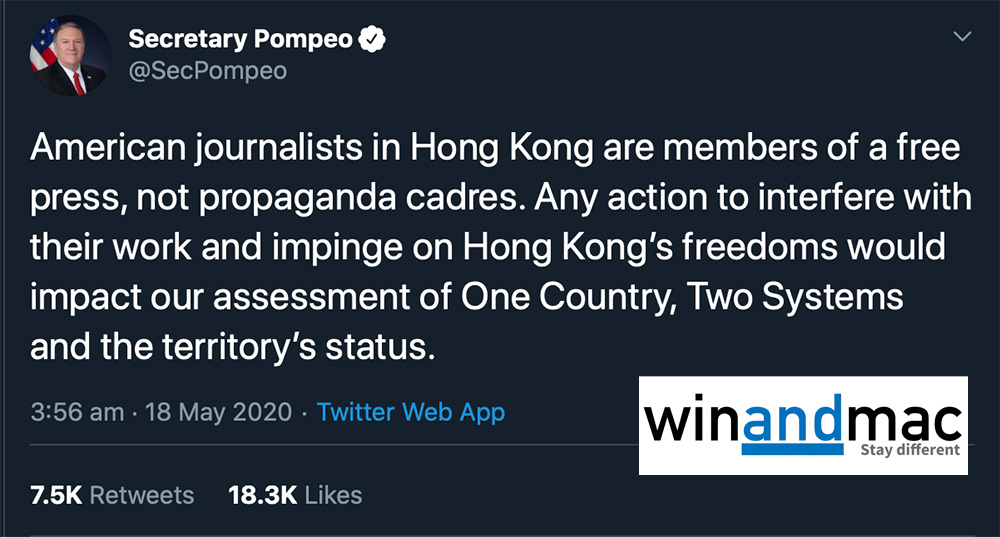 美國國務卿Mike Pompeo過往都曾公開批評中國,他在星期日又再次提到,相信身在香港的美國記者受到干預。他警告,北京對香港自治的行為將影響美國對香港的地位評估。