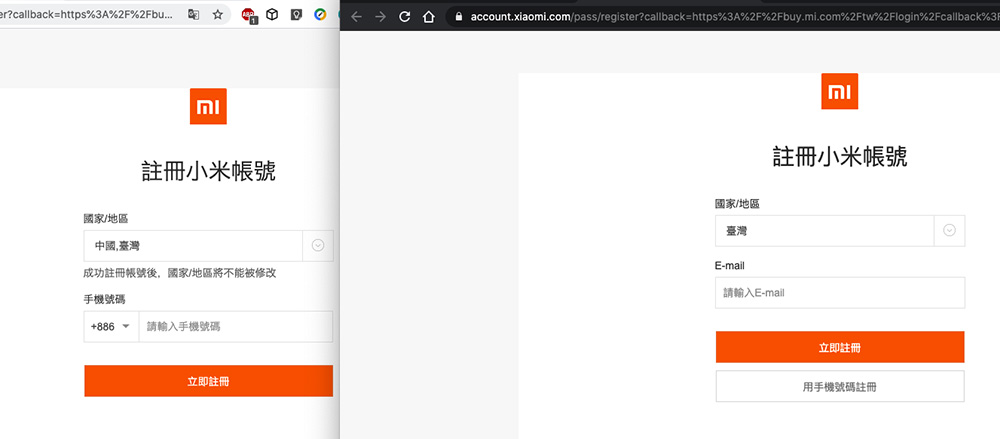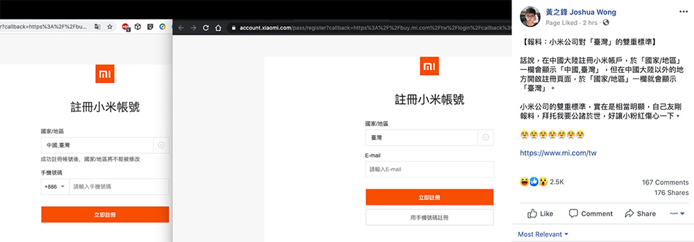 中國國家企業很喜歡在網站中,把台灣稱為中國台灣,又或Taiwan, China,以便向全球洗腦強調台灣是中國一部份。不過,黃之鋒就發現,小米台灣在台灣版的網站註冊表格中,就沒有寫道「中國臺灣」,但中國版則有。他質疑這是否雙重標準,並指「自己友剛報料,拜托我要公諸於世,好讓小粉紅傷心一下。」。