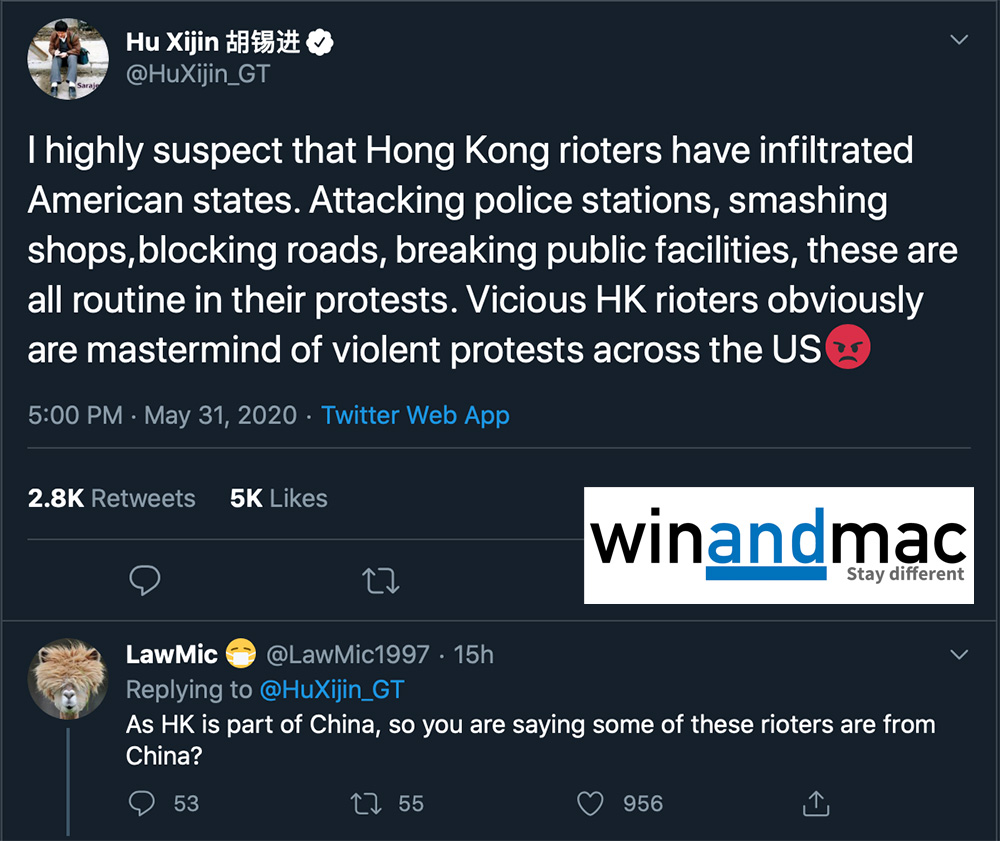 大陸官媒環球時報胡錫進經常在Twitter發表偉論,有些時候明明是假新聞,Twitter也完全零行動。數小時前,他在Twitter上指美國的大規模示威和騷亂,極度懷疑香港暴徒已經滲透美國各州,策劃有關行動。
