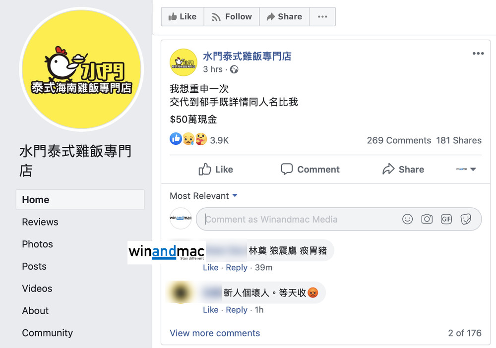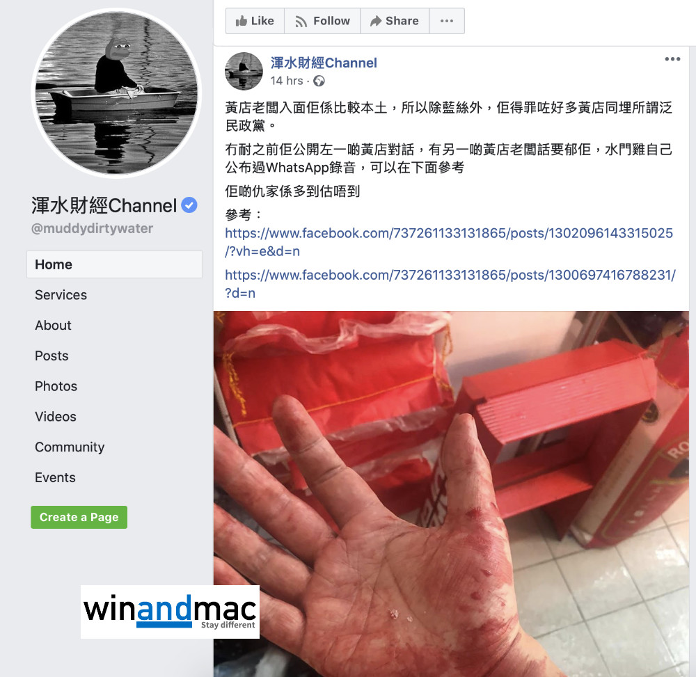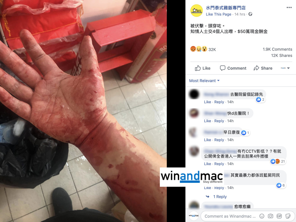 和其他黃店有點不同的是,水門泰式雞飯專門店老闆的敢言程度更強勁。日前他放上一張成手鮮血的相片,稱被伏擊兼頭穿。他希望知情人士交4個人出黎,即俾HK$50萬現金酬金。他今天亦再一次放上有關文章,稱若交到郁手的詳情和人名給他,將給予50萬現金。