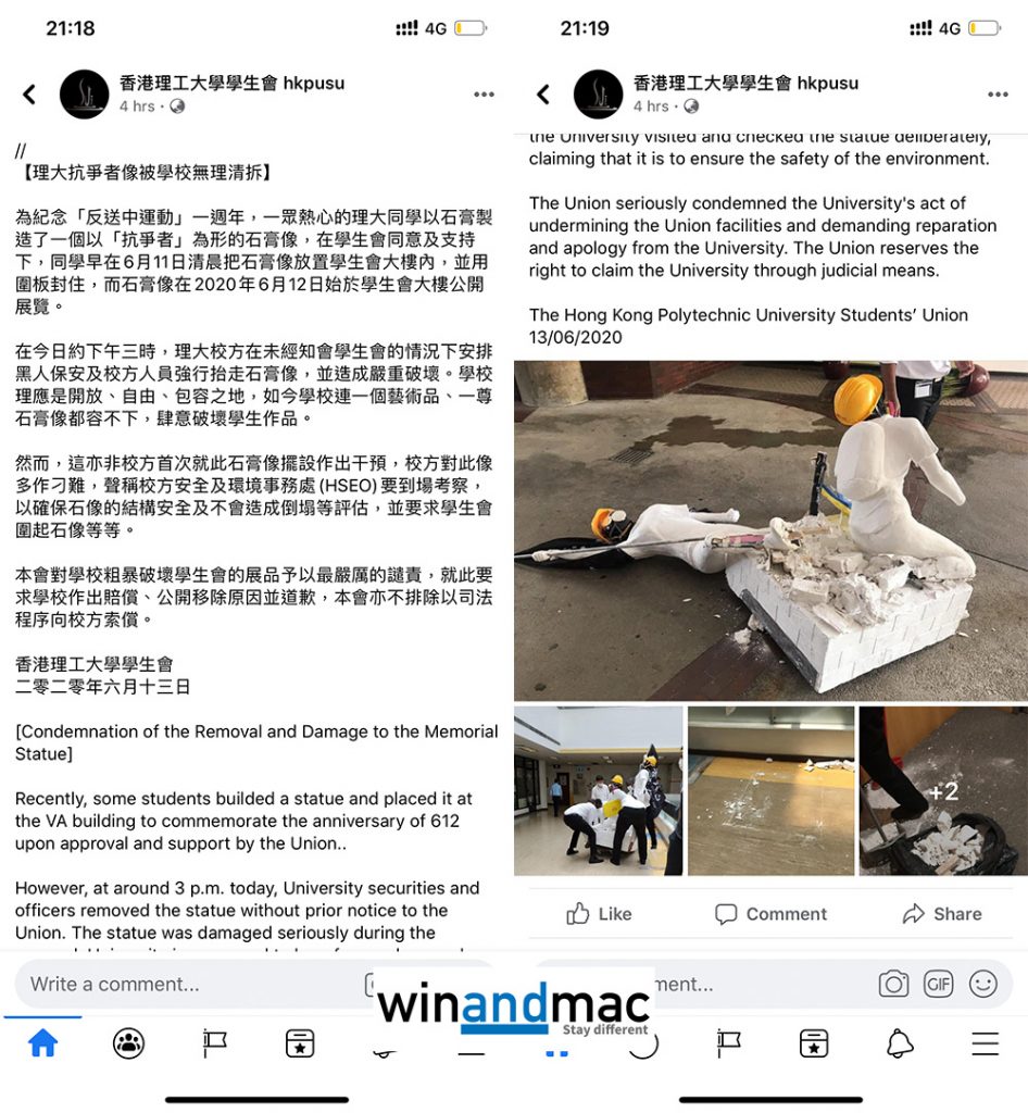 香港理工大學學生會表示,在他們同意及支持下,同學早在6月11日清晨把石膏像放置學生會大樓內,並用圍板封住。而石膏像在2020年6月12日始於學生會大樓公開展覽,但在日前約3:00pm時候,理大校方在未經知會學生會的情況下,安排保安和校方人員強行抬走石膏像,並造成嚴重破壞。