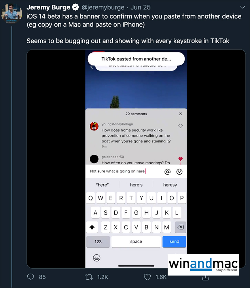 iOS 14測試版於數天前在WWDC2020公佈,當時蘋果有提到新版進一步加強安全功能,令用家用得更安全。當中在Keynote發佈會中沒提到的安全功能提升,就是會顯示apps是否存取系統的剪貼簿等功能,當中會在頂部顯示。有裝了iOS 14測試版的老外,嚇然發現抖音就算是身處外國,抖音app於用戶打字的時候,竟然狂讀系統剪貼簿的內容。若果用家本身把密碼等複製到剪貼簿,分分鐘有機會被抖音拎到。