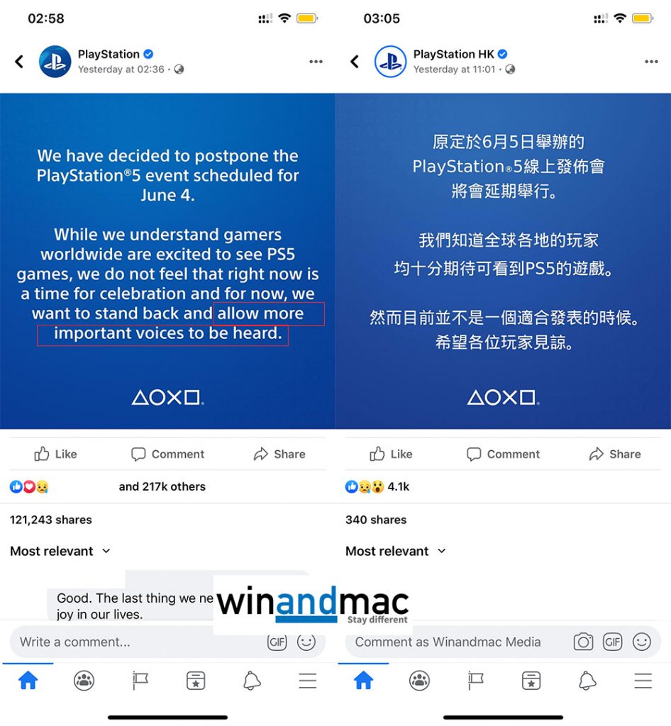 美國示威持續,大家都無乜心情,不少科技公司都暫停原定記者會或慶祝等活動,為黑人發聲。Sony Playstation原定在6月4日外國時間發佈新的遊戲機,亦因為這樣決定延遲。香港Sony Playstation也有類似消息發佈,不過本身都識英文的香港人,眼利發現兩邊發佈的內容不同。