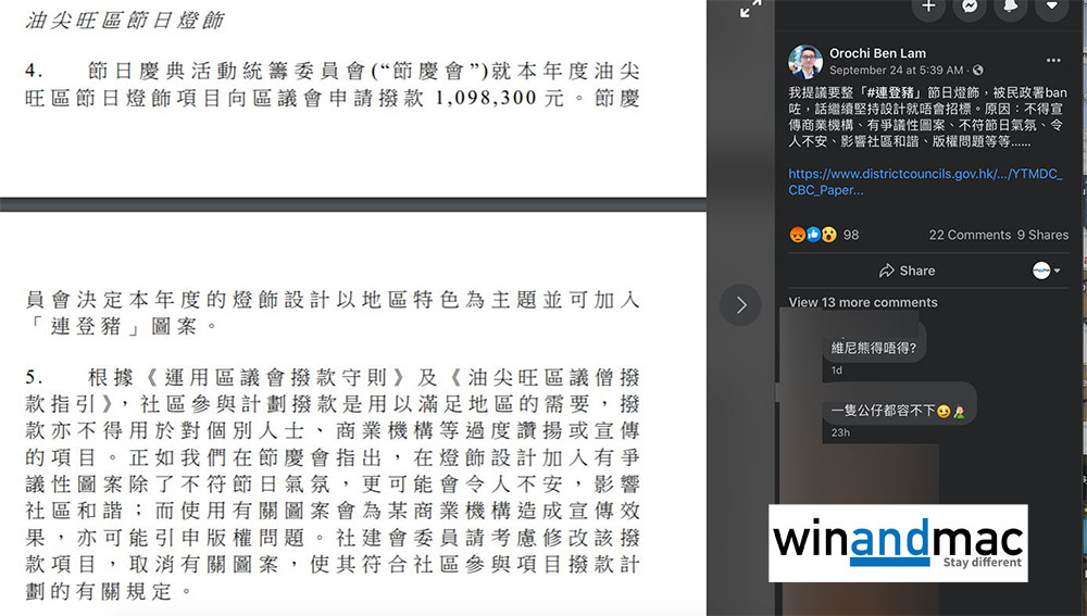 油尖旺區議員林兆彬提出在今年燈飾中,加入連登豬設計圖案。油尖旺區議會早前通過後,便入紙申請,可惜遭民政署反對。民政署稱加入有爭議性圖案,影響社區和諧和「令人不安」。他們還稱,可能會引申版權問題,以及會宣傳商業機構。林兆彬和不少網民批評,一隻公仔都容不下,亦有網民問若果轉用維尼熊得唔得。由於民政署堅持,若果不改就會無燈飾,結果社區撥款小組屈服。