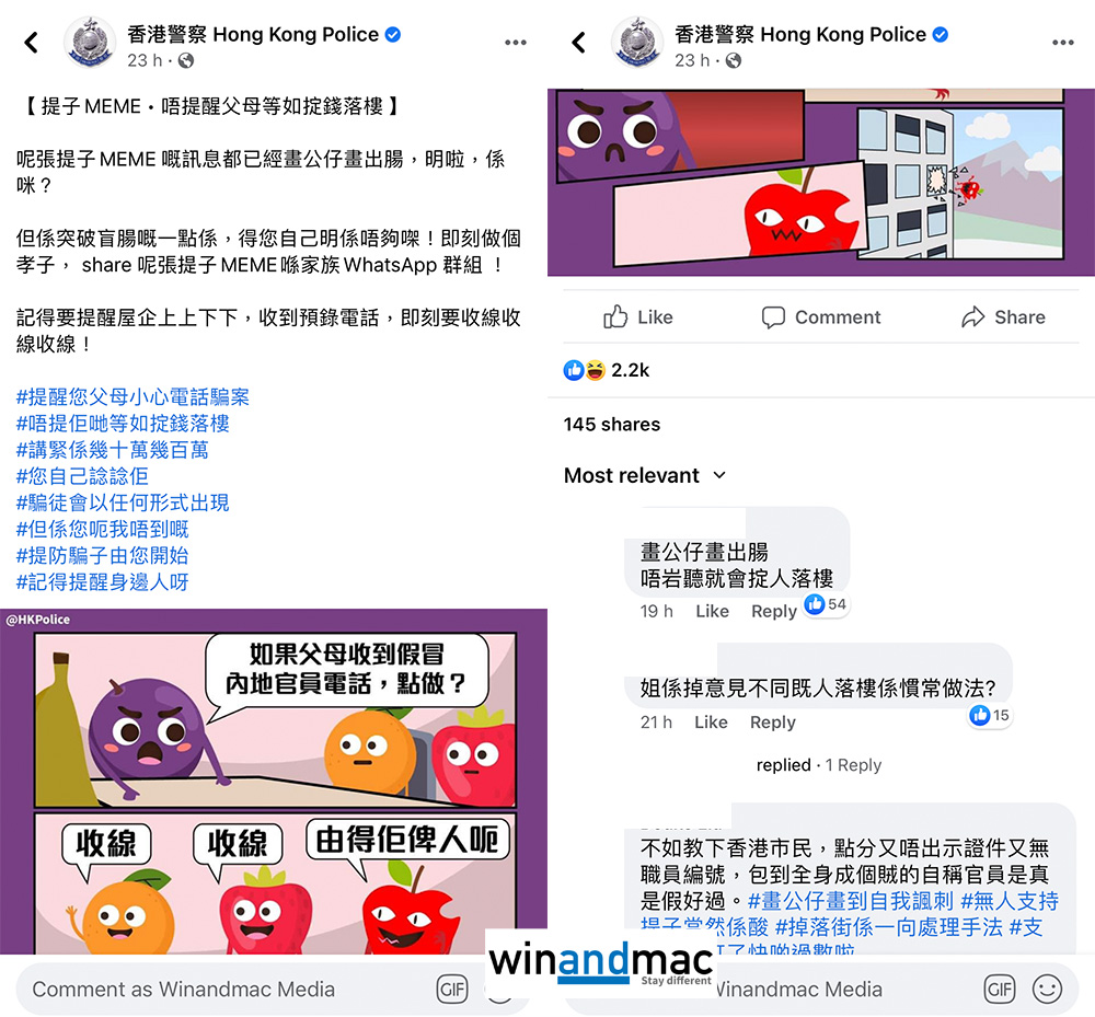 香港警察近年來都落足力做社交網絡,就連示威現場都有專人做直播,平時出post又不時用網絡潮流興的meme。可惜的是,他們過往推出的meme圖經常被網民狂串,稱理解意思錯誤。而在最近一次meme圖,希望提醒大家防止電話騙案,要大家提醒父母,但meme圖被香港警察改裝後,嚇親不少網民。
