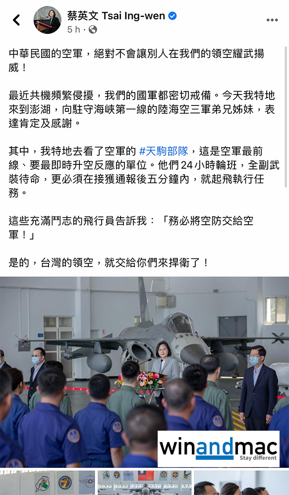 中國空軍近日經常有不少動作,甚至乎嚴重到走入台灣領空,令人擔心中國與台灣是否正式開戰。蔡英文早前的反應比較低調,但數小時前終於向外提到有關事件,嚴詞提到「中華民國的空軍,絕對不會讓別人在我們的領空耀武揚威!」