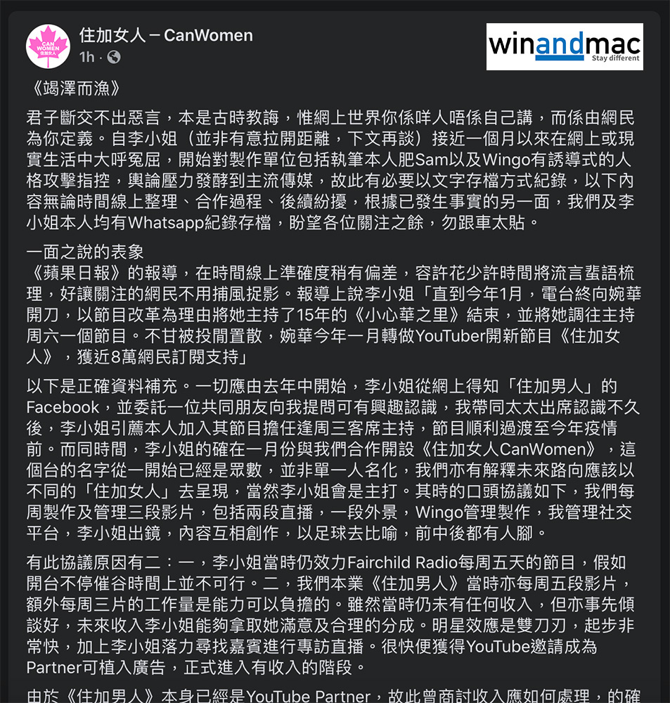 更新:住加男人在住加女人page發表千字文回應,最尾寫著「保留法律追究權利」。以下為擷圖,相關詳細回應可按此。