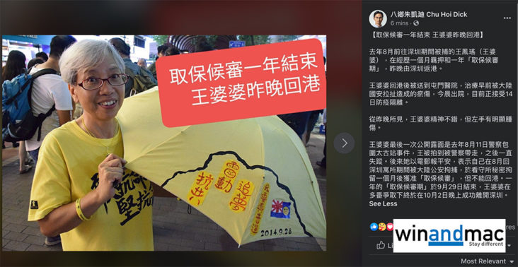 王婆婆最後一次公開露面是去年8月11日警察包圍太古站事件,被拍到被警察帶走,之後一直失蹤,不少人都擔心。後來她以電郵報平安,表示在8月回深圳寓所期間被大陸公安拘捕,於看守所秘密拘留一個月後獲准「取保候審」,但不能回港。後來在多番爭取下,於日前10月2日晚上成功離開深圳。