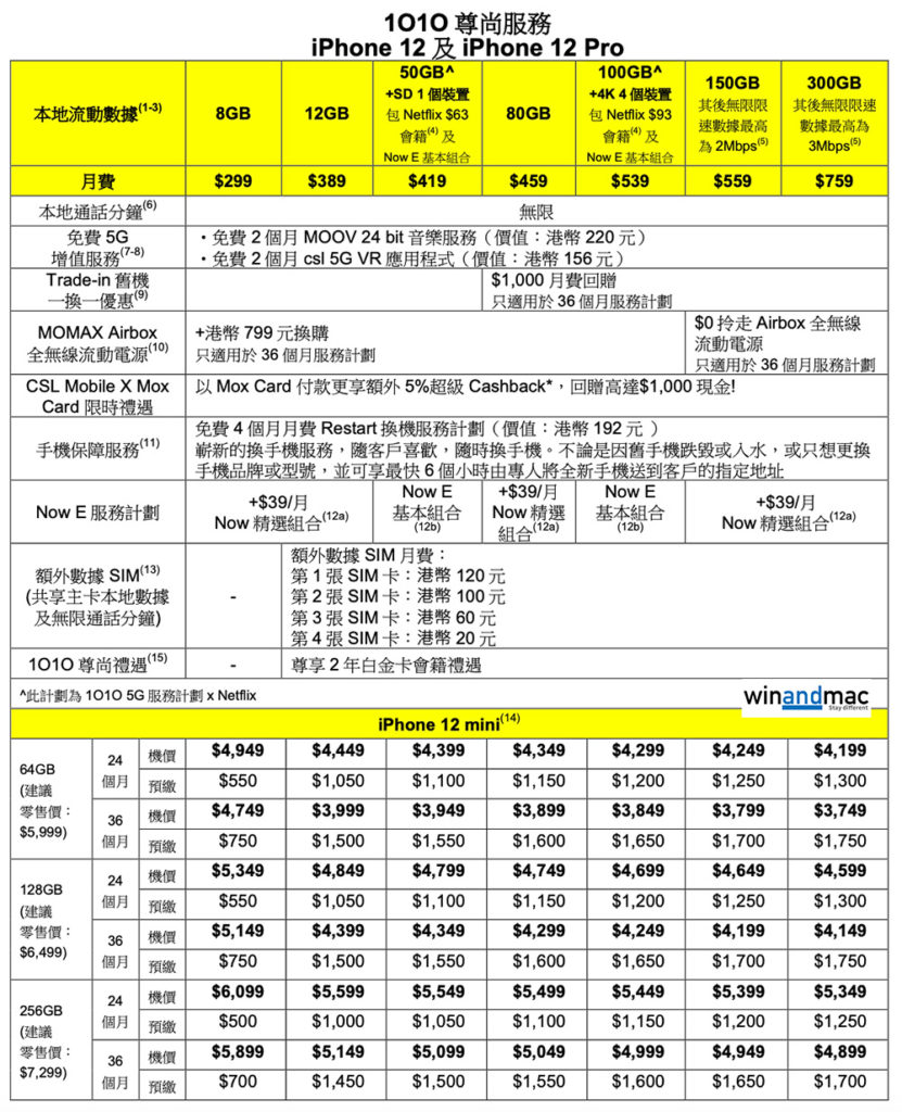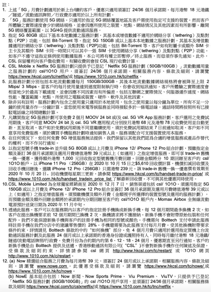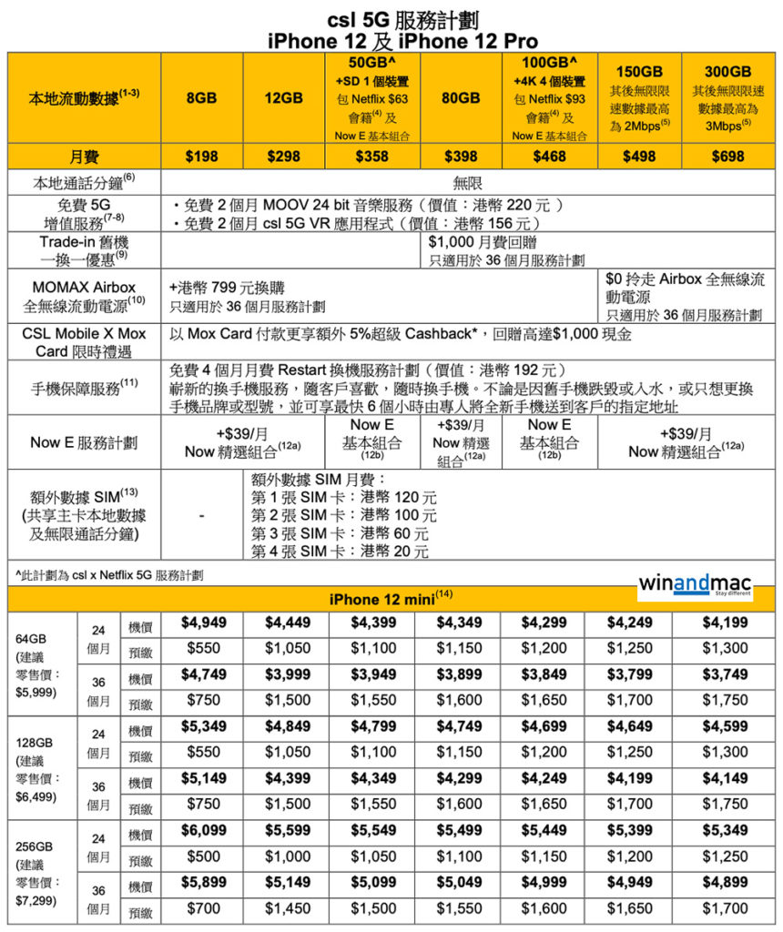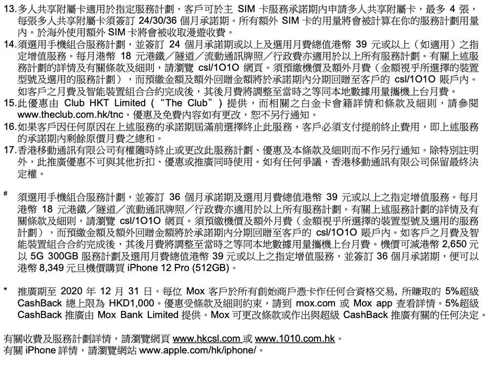 早前我們報道過,CSL Mobile推出了新的5G計劃,附送Netflix計劃。如今iPhone 12正式開始預售,CSL Mobile也開始接受用家預訂。今次轉載有關計劃讓大家參考,有興趣的可以去有關品牌網站或店舖查詢。若登記指定5G月費及iPhone 12/iPhone 12 Pro組合,並簽訂36個月承諾期,便可享機價折扣高達HK$2650。另外,CSL Mobile x Mox亦推出限時禮遇,以Mox Card付款更享額外5%超級Cashback。