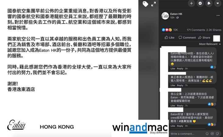 香港逸東酒店有幾撐香港,在過往很多事情中都可以看到。最近國泰與國泰港龍裁員,國泰港龍更停止營運,香港逸東酒店對此感到惋惜,並指兩家航空公司的員工出色,又說他們酒店前台、餐廳、酒吧、銷售及市場部等招募職位,誠邀國泰員工加入。香港逸東酒店更感謝國泰員工作為香港的全球大使,並指國泰員工的努力,他們並不會忘記。