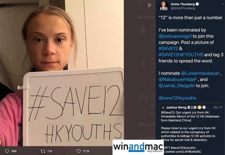 黃之鋒早前在社交網絡發佈短片,希望大家拿著白紙寫上#save12hkyouths和#save12,互相點名廣傳,讓世界各地的人更關注早前12名港人疑因偷渡時被送中的事情。環保少女通貝里Greta Thunberg也被黃之鋒點名,而通貝里則也不介意響應,在自己的社交網絡上發表文章,除了點名其他人外,也寫道12不止是數字而已。