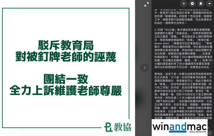 教協更提到教育局其實有派員在2019年9月去到學校,抽問五位不同班級的同學,五位都向教育局官員表示香港不可能獨立,教育局卻一直迴避這個事實。教協最後稱將會繼續努力,通過訴訟及緊急支援基金,全力支持老師上訴,並為老師提供緊急生活援助。教協也呼籲教師同工以及廣大市民,繼續以不同方式聲援和支持老師,為老師討回公道。