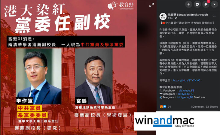 香港01及立場新聞均有消息報道,指香港大學將有兩位來自北京清華大學的大陸學者加入,其中清華大學工業工程系主任、黨委委員申作軍,將會擔任港大副校長(研究),至於清華地球系統科學系主任宮鵬,則會接任港大副校長(學術發展)。