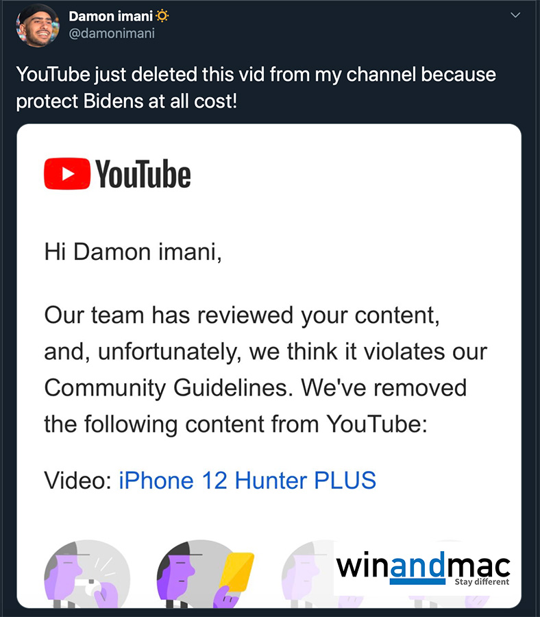 網民Damon imani惡搞了一個iPhone 12廣告,當中加入了大量疑似Hunter Biden早前流出照片(當然沒有露出重要部位)外,還加入共產黨的標誌,疑似想暗串拜登家族與中國和共產黨有商業活動。可惜的是,有關影片雖然沒有色情的部份,但YouTube竟然無故把其刪除。Damon imani認為,這是因為YouTube為了保護拜登,而在所不惜。