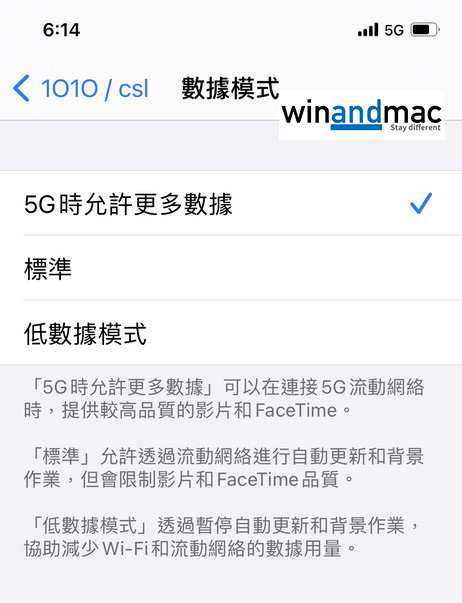 題外話,iPhone 12於使用5G網絡後,還可到數據模式內,選擇使用5G網絡的方式。如5G時允許使用更多數據,就可利用5G網絡進行Face Time視像通話,其他選項則可減低數據用量的消耗。