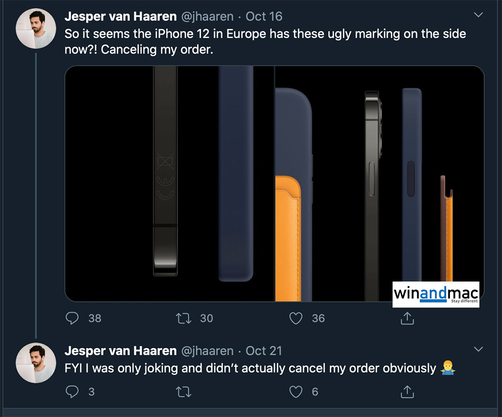 因為歐洲規定,電子產品一定要印上上述兩個圖示,iPhone過往是印在背面,但今年開始不知什麼原因(估計是機背物料不同),要把法律與規範圖示印在機身旁邊,故此出現此情況。至於美國等地,則允許以電子方式放在iOS中(於系統設定>一般>法律與規範看到即可)。有網民稱覺得核突想取消訂單,但後來又回心轉意不取消。