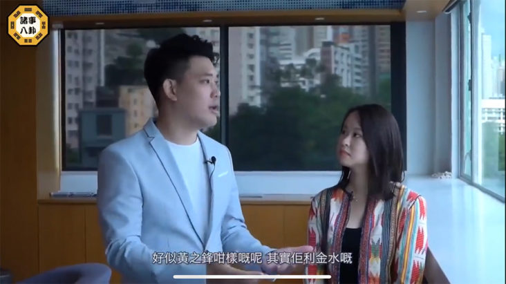 黃之鋒今天忍不住再分享一段來自親中媒體的影片,當中是「諸事八卦」的網上節目,有聲稱是風水師傅分析運勢。主持人一開始就說黃之鋒原本住海怡半島,緊接就說黃之鋒最近好似忽然富貴搬去貝沙灣。然後,風水師傅就說「好似黃之鋒咁,佢其實利金水」,然後就說黃之鋒無論住海怡半島或貝沙灣,也很適合黃之鋒住,又言之鑿鑿說這樣對黃之鋒好,會平穩一點。