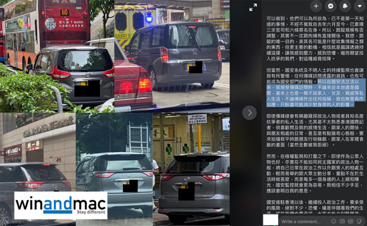 早前有親中傳媒拍到,稱黃之鋒自己梳乎,帶女伴去酒店過夜。其實黃之鋒自參政以來,都很少提到家人和身邊的人。黃之鋒於社交網絡上曾發千字出文,似乎想回應有關事件。標題是「被同一車隊連續跟蹤十天的日常 —— 與恐懼並存並持續抵抗」,內文則提到被人跟蹤情況。當中他寫道「不論來自本地還是國際,基本上也是一概不談家人、女友、親戚等私人生活」,續指「不論傳媒作出任何指稱,我也無意再作回應,只盼盡可能減少對身旁的人的影響。」,似乎就是對近日報道作出回應。