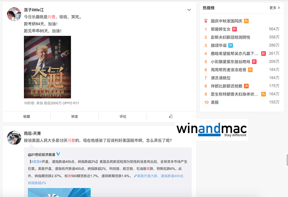 相反,微博則有大量網民狂賀,還有人製作了「奪冠」海報,狂串特朗普奪了新冠肺炎(武漢肺炎)。微博都有少數人士稱不應自high,因為其他國家的事與自己無關。