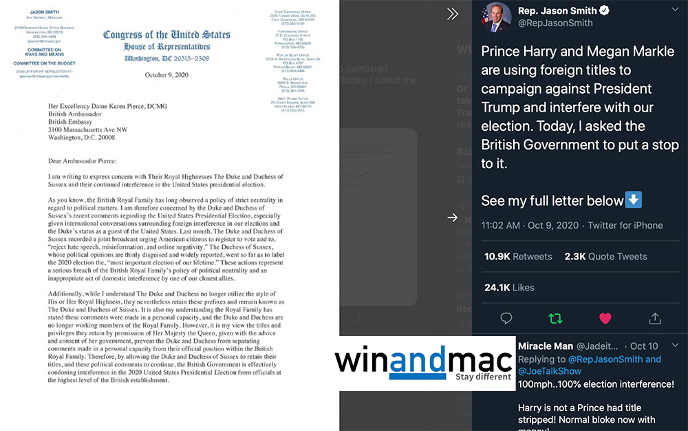哈里王子雖然辭去職務,但他仍然擁有英國一定程度的頭銜,故此有必要保持政治中立。Jason Smith也是利用有關理據,並呼籲英國政府剝奪兩人Duke of Sussex公爵及公爵夫人的頭銜、稱呼以及一切特權。有關信件中提到,若不剝奪的話,這表示英國這位最親密的盟友,實際上是容忍英國最高層人員干預2020年美國總統大選。