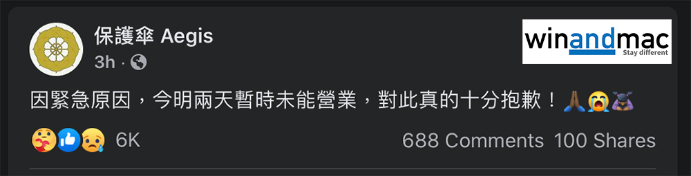 保護傘也在Facebook發表文章,稱「因緊急原因,今明兩天暫時未能營業,對此真的十分抱歉!」
