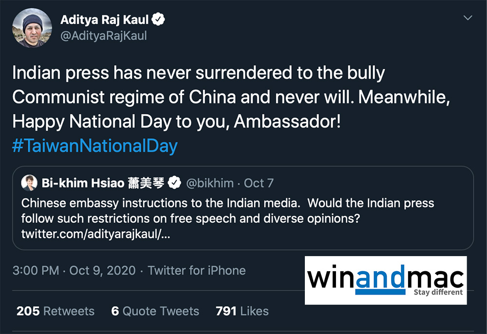 台灣駐美國代表蕭美琴也有轉載消息,印度獨立記者都立即再祝賀台灣雙十國慶。