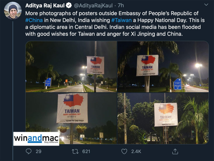中國駐印度大使館早前出信,嚴厲警告印度傳媒不要再報道台灣雙十國慶,並要求他們尊重一個中國原則,又無故代表印度政府聲稱政府也這樣做,所以印度傳媒要遵守。印度傳媒工作者即時嬲爆,表明不會屈服。今天正式是雙十國慶,有當地記者發現,於中國駐印度大使館外有大量恭賀台灣雙十國慶的海報,據稱就算是軍事較嚴謹的區域也有類似海報。記者更稱,社交網絡上印度人都很討厭習近平和中國。