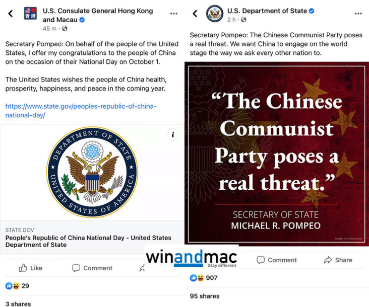 10月1日中國國慶,雖然天下圍中,但其他國家循例都會作出恭賀。美國駐香港領事館於社交網絡Facebook發表一段由國務卿Mike Pompeo所寫的新聞稿,內容十分簡短,僅恭賀中國國慶日,並希望在來年中國人健康、興旺、快樂及和平。可是,有趣的是,在美國國務院的Facebook則發表完全不同的文章。