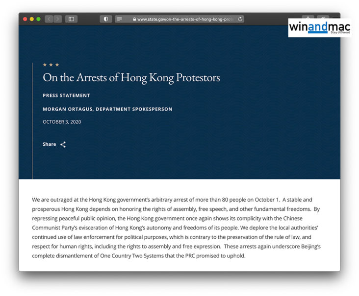 美國國務院剛發佈最新文章,就10月1日的事情作出評論,他們對於港府於當天拘捕超過80人感到憤怒。他們認為,香港的繁榮穩定建基於言論自由、遊行集會自由及其他基本的人權自由。港府這樣禁止和平表達意見,揭示港府再一次與中國共產黨合謀,拿走香港的高度自治與人權自由。