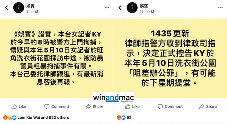 除港台外,今天又再有記者被捕。網媒娛賓女記者KY今早8點,被警方上門拘捕。娛賓在Facebook指出,律師指警方收到律政司指示,決定正式控告女記者KY於本年5月10日洗衣街公園「阻差辦公罪」。目前等候進行保釋手續。