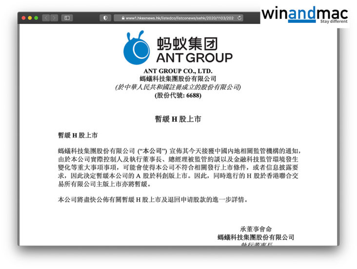 結果,港交所發出公告,確認螞蟻科技集團股份有限公司(6688)發生重大變化事項,可能會使其不符合相關發行上市條件,或者信息披露要求,因此決定暫緩A股於科創版上市,而同時進行的H股於香港聯合交易所有限公司主版上市亦將暫緩。