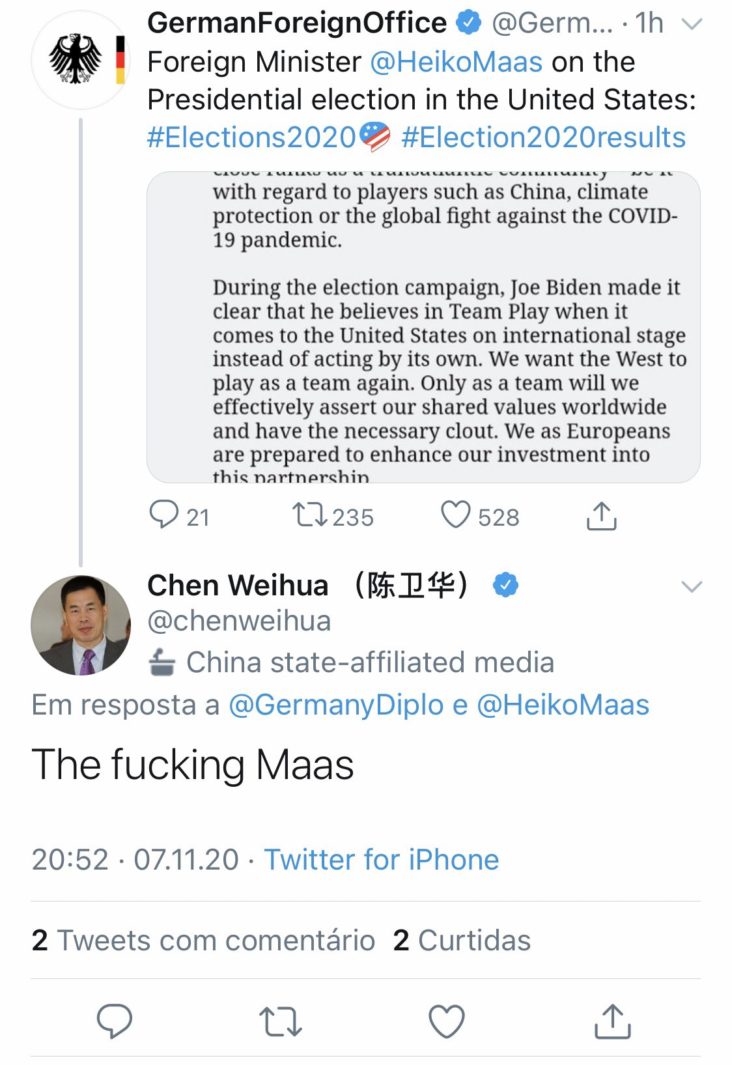 可惜的是China Daily中國日報歐洲分社社長陳衛華,竟然直接以The funking Maas回應德國外交部的文章。後來終於刪除文章,但幸好智庫Global Public Policy Institute創辦人Thorsten Benner成功cap圖留底,讓大家看看中國戰狼外交的特色。
