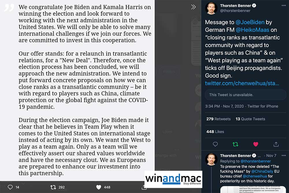 據羅冠聰在網上提到,德國外長馬斯Heiko Maas於傳媒宣布民主黨拜登勝選後,發聲明祝賀。馬斯提到在選舉正式結束後,將與新政府聯繫,商討歐美如何合作應對中國、氣候變化和武漢肺炎。馬斯續指,拜登在競選時承諾美國在國際舞台上,將會與其他國家團結合作。他認為,只有西方再次團結起來成為一個團隊,才能在全球範圍內有效維護共同價值觀,並擁有必要的影響力。