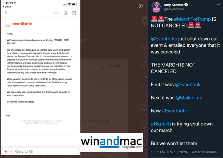 美國有人發起MarchForTrump示威遊行,並以網上舉行活動的平台Eventbrite發佈,可惜的是Eventbrite竟然主動刪除有關活動,並指搞手不可以發佈或分享可能有害的資訊。Amy Kremer在網上發表文章,大罵Eventbrite做法,指是繼Facebook、Mailchimp後,又一科技公司打壓政見不同的聲音。Amy稱有關遊行並無取消,會如常在當地時間星期六12pm於華盛頓Freedom Plaza舉行,指不能接受別人打壓。