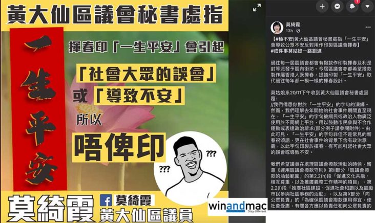 慈雲東區議員莫綺霞在社交網絡發表文章,稱早前黃大仙區議會提議印製「一生平安」揮春,但最終收到民政事務處(民政處)旗下的黃大仙區議會秘書處拒絕,稱因為一生平安揮春會導致公眾不安。