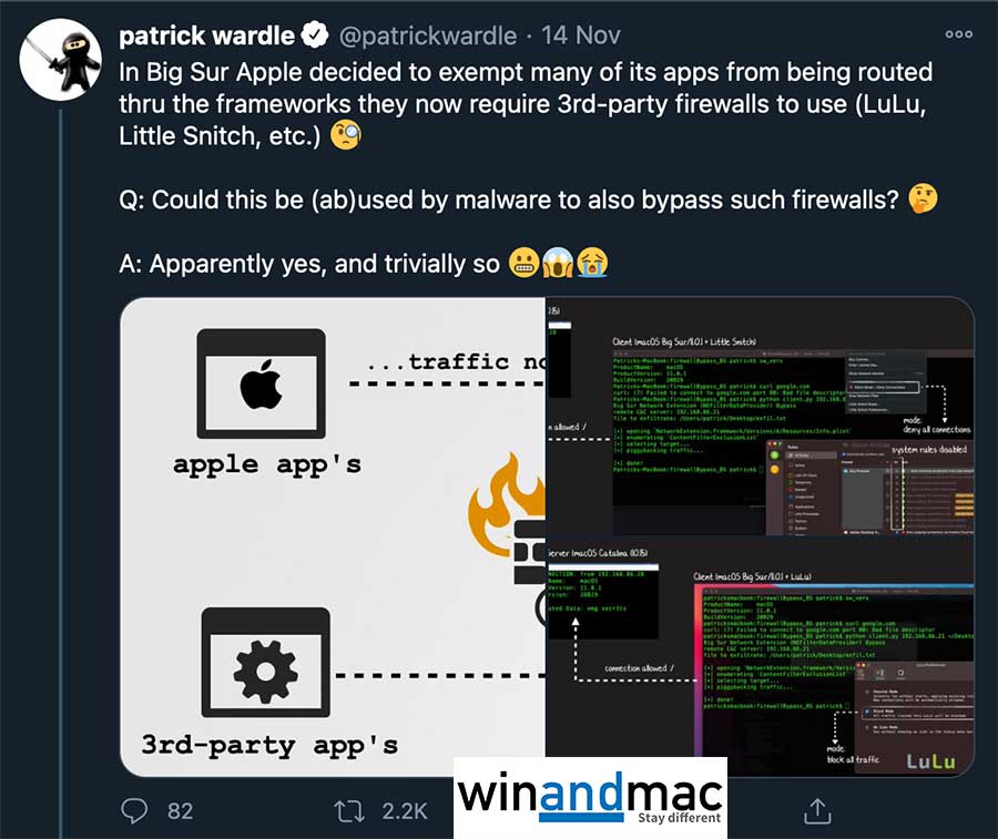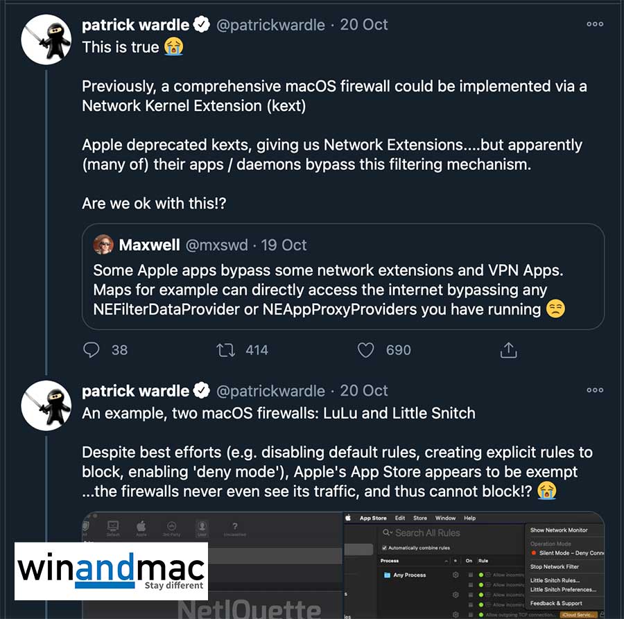 macOS Big Sur正式版推出後,眾人期望蘋果會修復有關問題,但Patrick等安全專家發現蘋果沒有這樣做,蘋果自家的apps仍然可以自動穿過防火牆或VPN,直接連線上網。一班安全專家擔心這樣做就像打開後門,其他惡意程式絕對可以扮成蘋果自家apps,直接連線上網,跳過防火牆或VPN,引發恐怖的情況。Patrick更上載多張圖片,認為惡意程式是可以扮成蘋果apps跳過防火牆檢查。