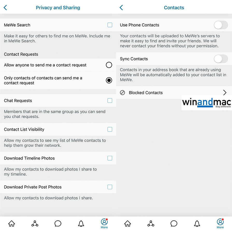 不過,很多人新開MeWe戶口後,就算不公開邀請,也突然收到大量Contact Request聯絡人邀請,而且加的人名字又不清楚,令人感到困擾。用家若果不想再收到類似的邀請,在開通戶口後,按More分頁再按左上方的設定,揀選Privacy and Sharing,於第一項MeWe Search可以取消選取,這樣可以避免其他人這麼容易找到你。但用家仍然可以透過QR Code或連結,讓朋友加自己入MeWe。