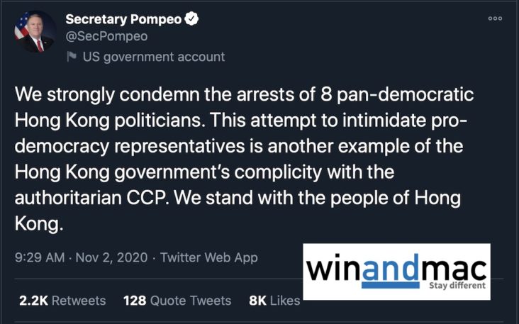 美國一直就香港事情都十分關注,最近除了要求釋放鍾翰林等學生外,數小時前也發表社交文章,關注日前多名泛民議員被捕事件。美國國 務卿Mike Pompeo提到,這又是另一個例子,突顯香港政府只是服從中國共產黨極權。他與香港人同在。