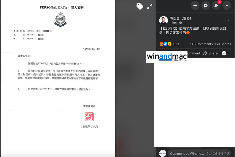 陳志全在社交網絡上稱立此存照,「雖然早知結果,但收到警察這封信,仍然非常憤怒」。