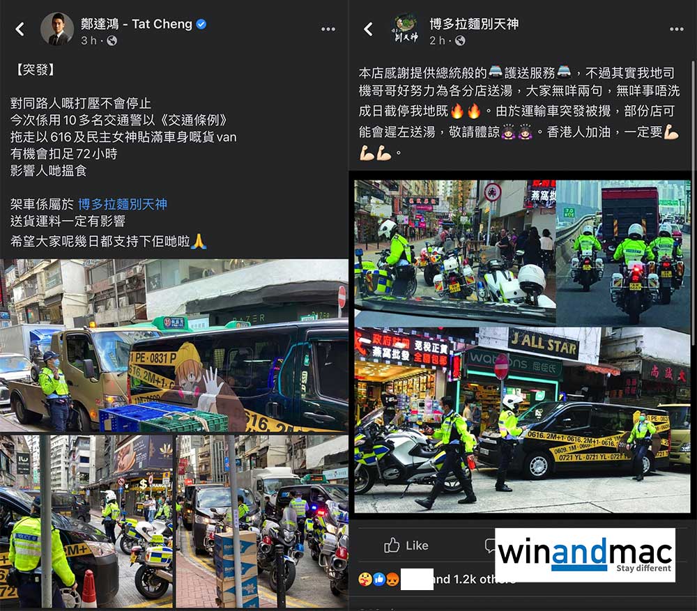 除了口罩有點「黃」會被建制追擊外,連私家車太「黃」也不行。鄭達鴻在Facebook中發表文章,提到博多拉麵別天神的一架貨車,竟然突然被10多名交通警以交通條例拖走,有機會扣留長達72小時。有關貨車車身上有616及民主女神貼紙,鄭達鴻認為明顯是對同路人的打壓,希望大家呢幾日多點支持博多拉麵別天神。