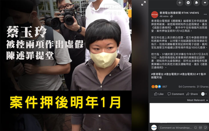 早前負責香港電台《鏗鏘集》元朗7.21專題的編導蔡玉玲,被指因為以虛假陳述進行「查冊」被捕,政府因為她是合約員工拒絕提供法律支援。今日她在粉嶺裁判法院提堂,案件押後至明年1月14日再訊,裁判官批准蔡玉玲繼續以原有條件現金1000元擔保。